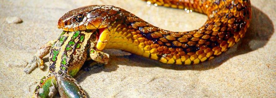 I just watched this snake, mesmerised. It was like nothing Iโd ever seen before. It had the most striking yellow and brown horizontal stripes running across its body. The colourful scales shimmered and glistened in the sunlight. Although now sadly passed, its meal too was beautifully coloured with bright greens and creamy yellows. But the snakeโs eyes never left me and it watched me the whole time while slowly consuming its slippery meal.
