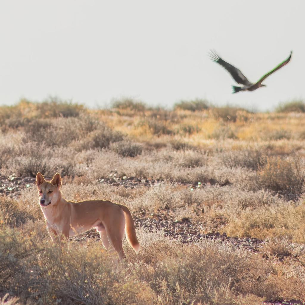 Above: An Australian dingo scans for the threatening Wedge Tailed Eagle, 10 km north of The Dingo Fence, South Australia.